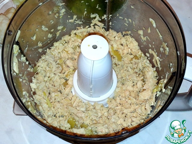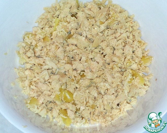 Мясо курицы и вареный лук я измельчила.