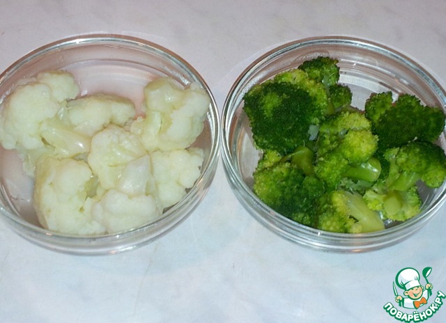 Капусту цветную и брокколи положила на три минуты в кипящую воду, затем измельчила.