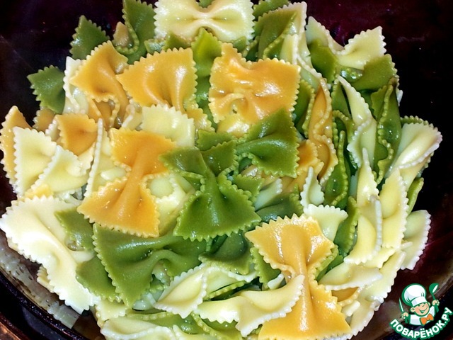 Бантики высыпала в кастрюлю с подсоленной кипящей водой и варила 12 минут. Во время варки добавила 2 столовых ложки масла. Готовые бантики откинула через дуршлаг.