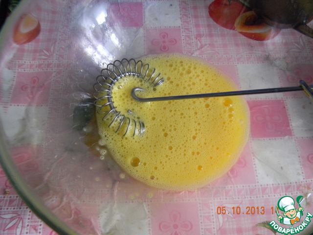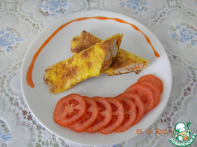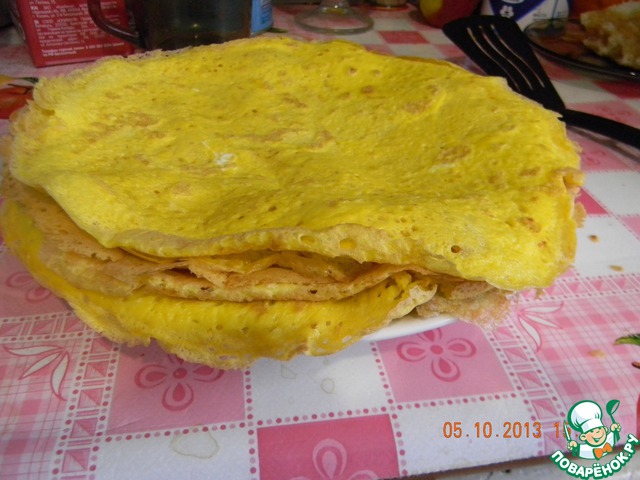 Взбиваем одно яйцо, 1 ч ложка воды и соль по вкусу и делаем блинчики... И так далее с каждым яйцом отдельно.. Первые 2 блина могут получиться не удачно... Смазать сковородку один раз только...