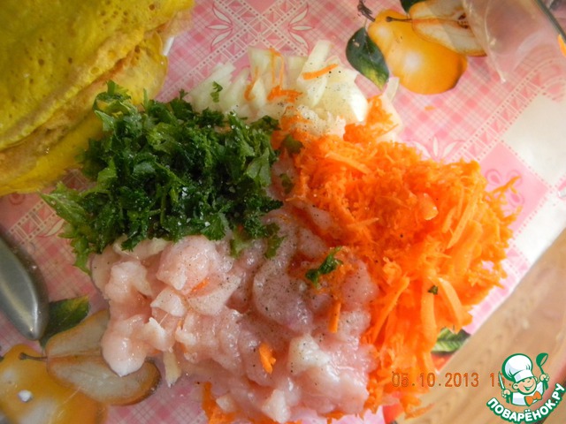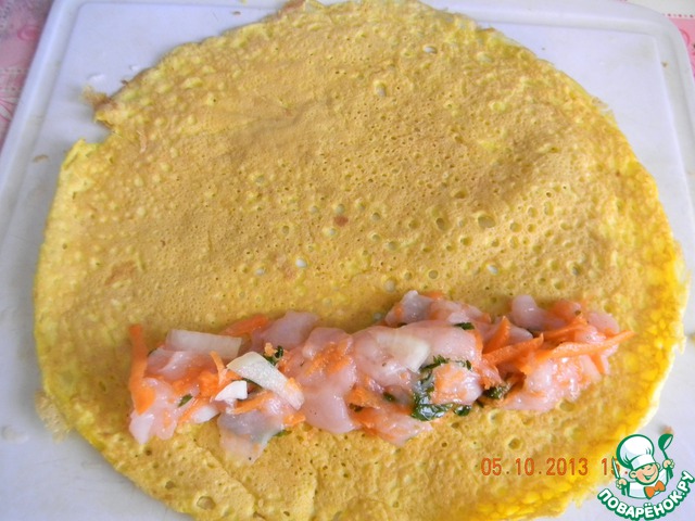 Накладываем начинку в блин и закручиваем в трубочку. Затем берем противень намазанный маслом и выкладываем все туда..