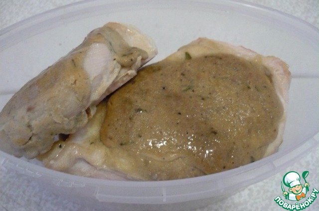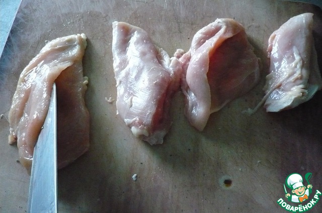 Куриную грудку разделить на порционные куски. В каждой прорезать карман и намазать соусом.