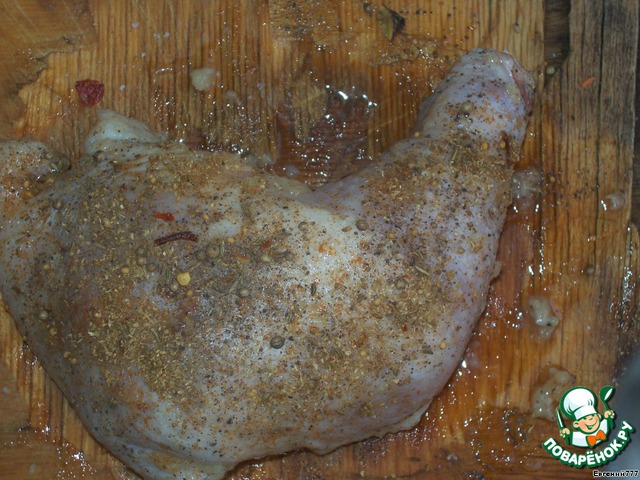 Берем окорочок, натираем его чесночком, перчиком, приправой для окорочков, гриля или шашлыка.