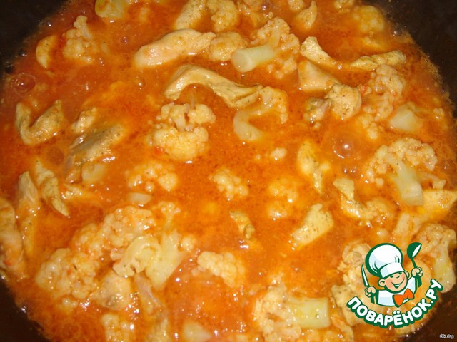 Добавить цветную капусту, перемешать. Тушить, помешивая, чтобы жидкость слегка уварилась. За 5 минут до готовности приправить солью и добавить карри, довольно много, чтобы курица приобрела желтоватый оттенок. Все перемешать, довести до кипения и снять с огня.