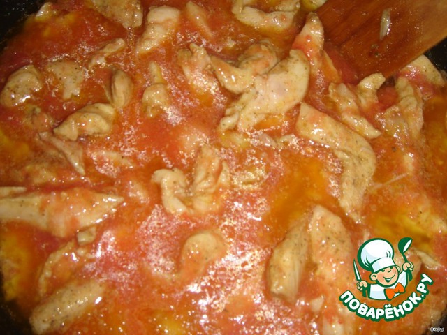 В курицу добавить рубленый чеснок, перемешать. Потереть на мелкой терке помидоры и добавить к курице. Немного протушить.
