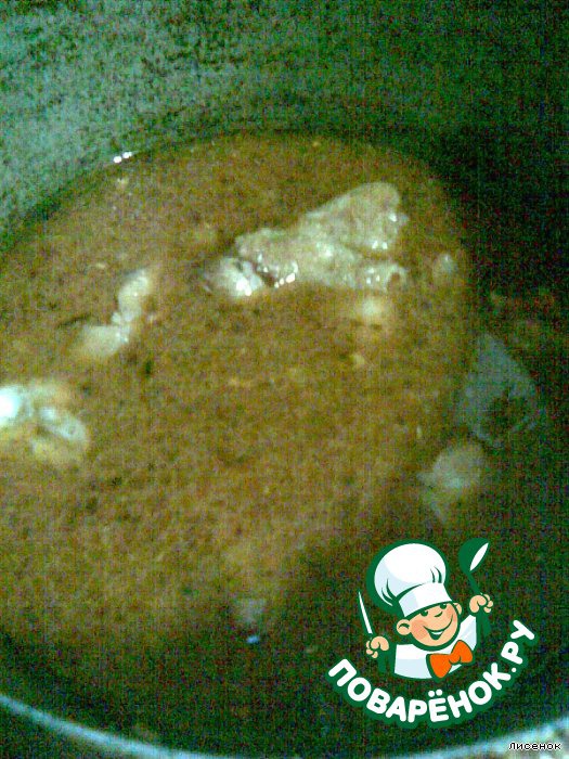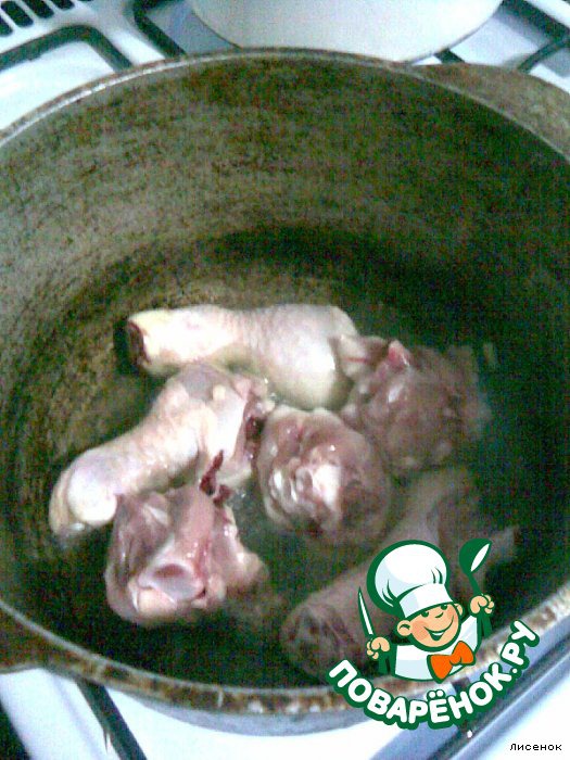 Голень рубим на 2 части, обжариваем (солим, перчим, добавляем любимые специи).