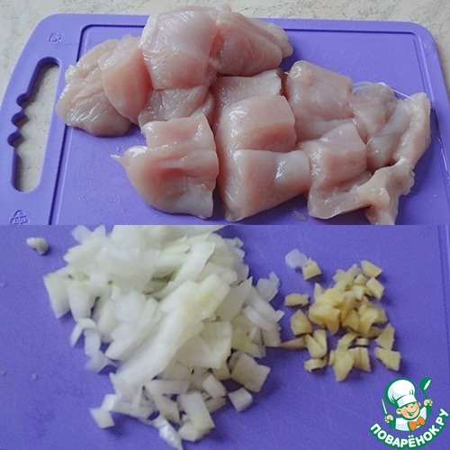 Почистите и порежьте лук и имбирь. Крупно порежьте куриную грудку.