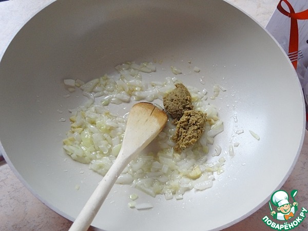 Разогрейте растительное масло в глубокой сковороде. Жарьте лук с имбирем до мягкости. Вмешайте пасту карри (у меня зелёная) и готовьте на слабом огне минутку. Следите, чтоб не пригорело.
