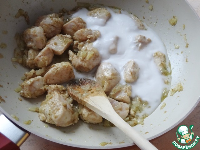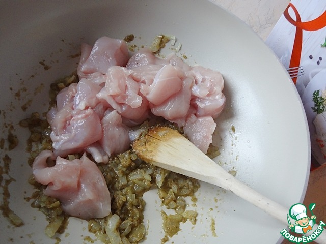 Положите в сковороду ломтики курицы, перемешав их с пряным луком. Готовьте, пока ломтики не побелеют.