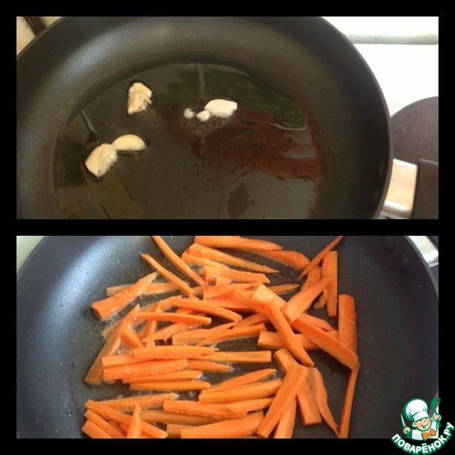На раскаленной сковороде в небольшом количестве масла обжариваем чеснок, раздавленный плашмя лезвием ножа, затем чеснок выкидываем и в этом ароматном масле обжариваем морковь, порезанную соломкой