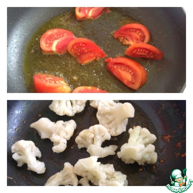 Морковь выложили на блюдо и в этом же масле очень быстро с двух сторон обжариваем помидоры крупно порезанные. Помидоры убираем к моркови и обжариваем цветную капусту предварительно отваренную в подсоленой воде, буквально 3 мин