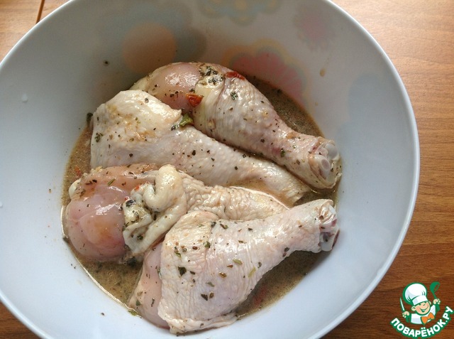 Голени маринуем со специями и составляющими входящими в маринад, добавляем соль и перец, оставляем на 30 мин