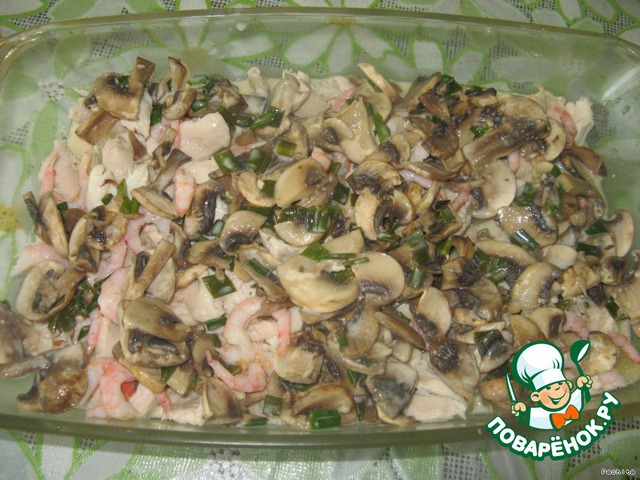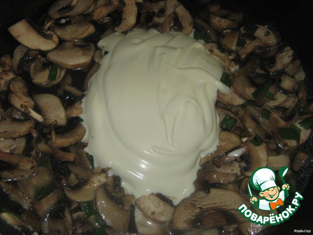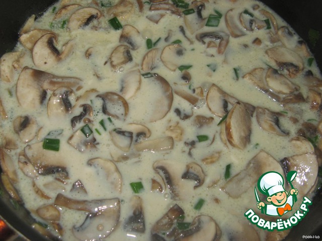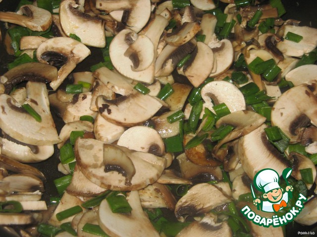 После этого мясо переложить, а на сковороде обжарить нарезанные шампиньоны и зелёный лук.