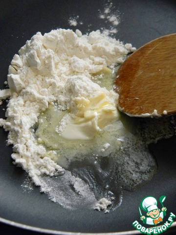 Сковороду нагреть. Положить кусочек масла и муку. Когда масло растает, перемешать, немного поджарить.