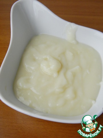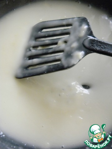 Убавить огонь, тонкой струйкой влить бульон от курицы (150 мл), постоянно помешивая. Должен получиться однородный соус, без комочков.