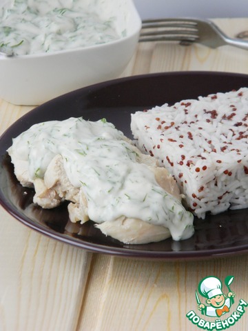 Теперь формируем блюдо. Выкладываем микс риса с киноа, рядом укладываем курицу и поливаем соусом, если любите погорячее, можно подогреть курицу.