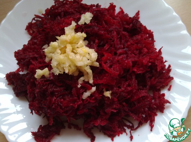 Свеклу натереть на мелкой терке. Чеснок выдавить через пресс.