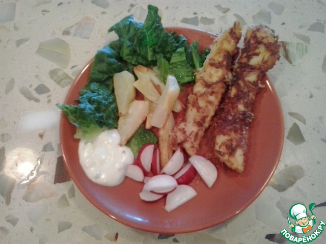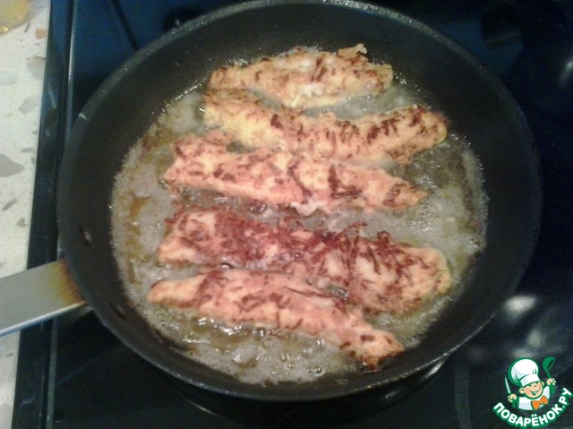 Выкладываем кусочки на сковороду и жарим с двух сторон по паре минут до корочки.