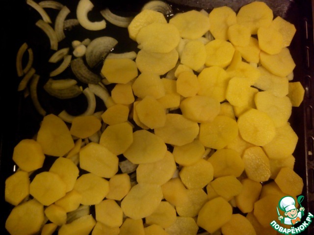 Противень смазываем маслом, выкладываем лук, сверху картошку.
