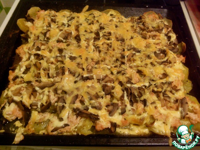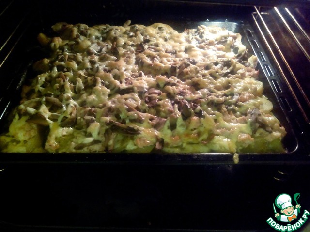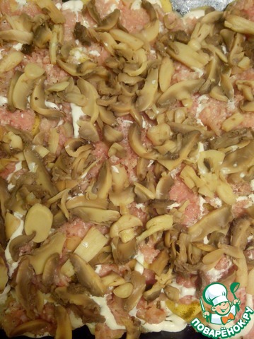 Затем выкладываем шампиньоны. У меня - нарезанные из банки (наиболее быстрый способ).