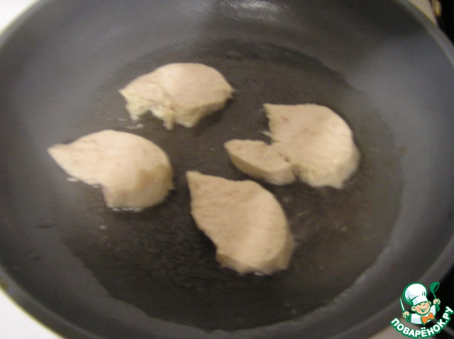 Куриную грудку нарезать пластиками поперек волокон, чуть залить водой и потушить на сковороде с антипригарным покрытием 10 минут