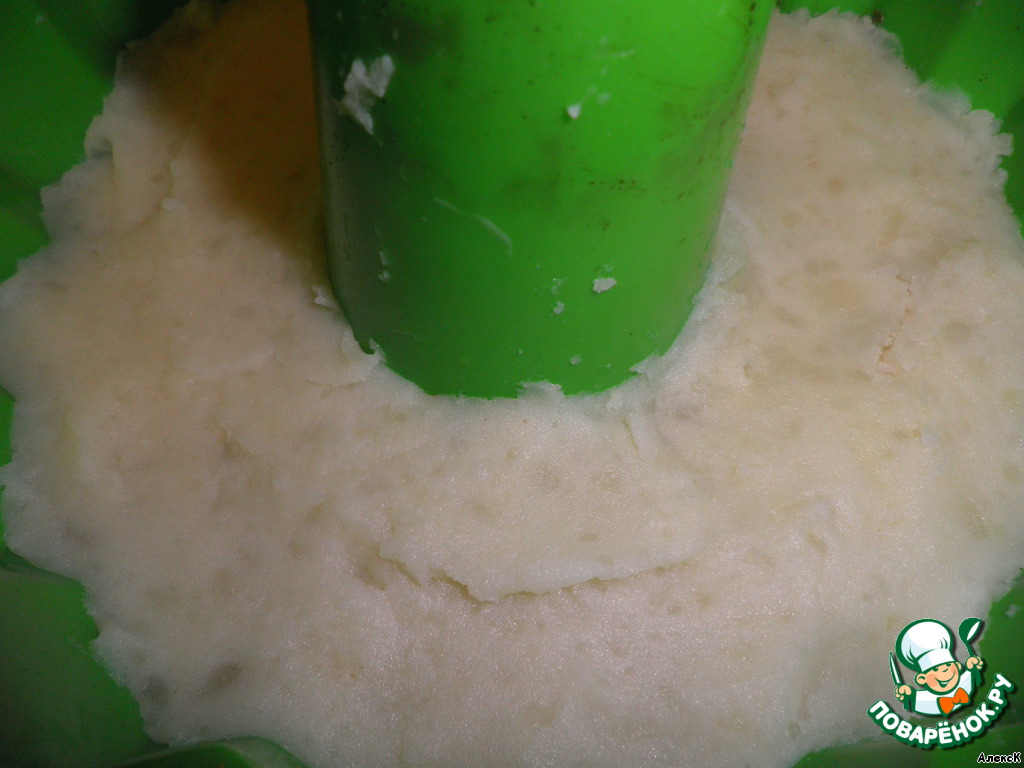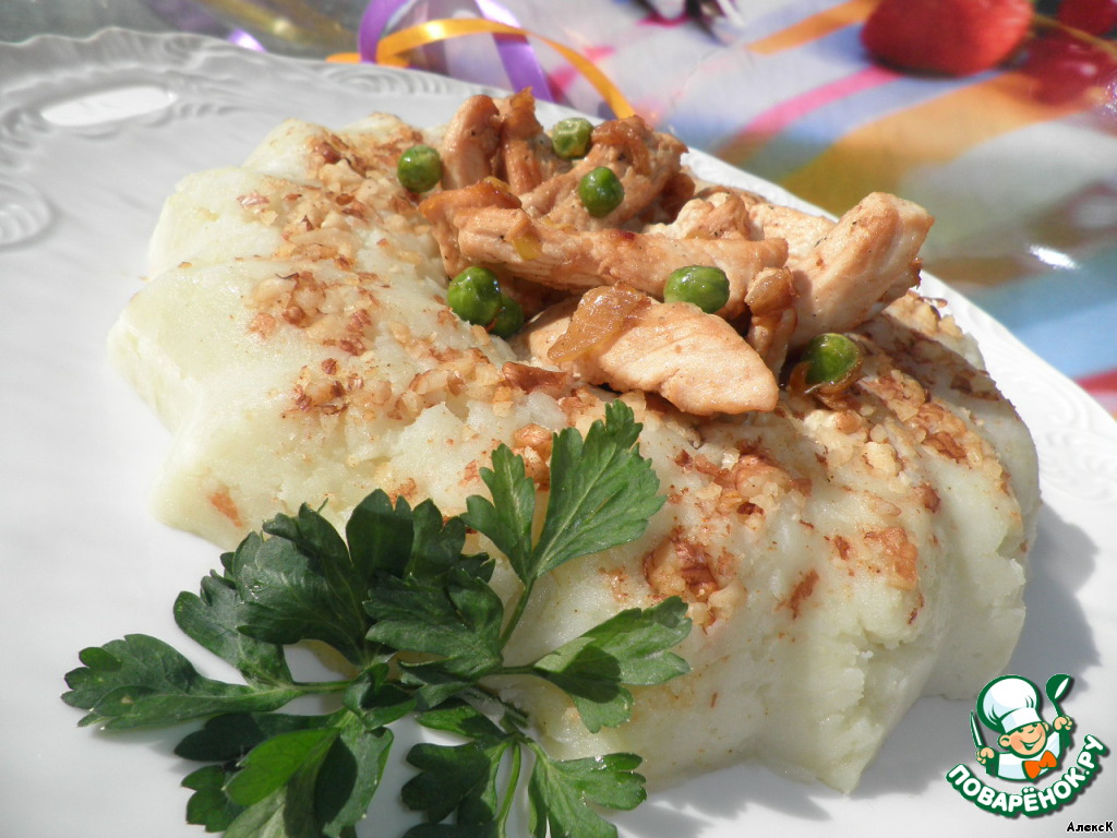 Смазать маслом форму в виде кольца и посыпать нарубленными грецкими орехами. Положить теплое пюре в форму и слегка прижать.