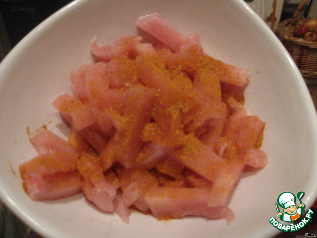 Куриные грудки, нарезанные соломкой минут 15 маринуем в лимонном соке и специях.
