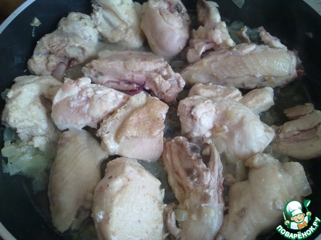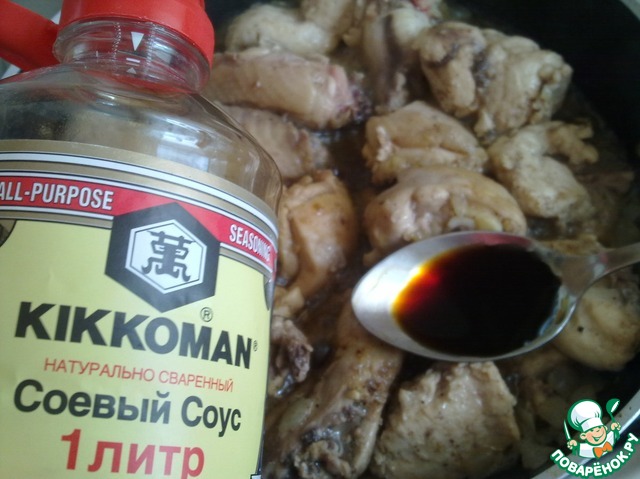 Затем полить коньяком, добавить соевый соус "Kikkoman" и немного кипящей воды. Закрыть сковороду крышкой и тушить курицу до готовности на слабом огне. Когда подлива загустеет, блюдо готово.