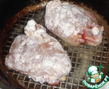 Куриные бедра посыпать мускатным орехом, солью и перцем по вкусу. Оставить на 15-20 минут. Затем обвалять в муке и обжарить до золотистого цвета с двух сторон.