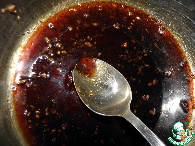 Маринад, в котором были голени, поставить на средний огонь, и постоянно помешивая уварить до густого состояния. За 15 минут до готовности курочки, достать голени и обильно смазать маринадом