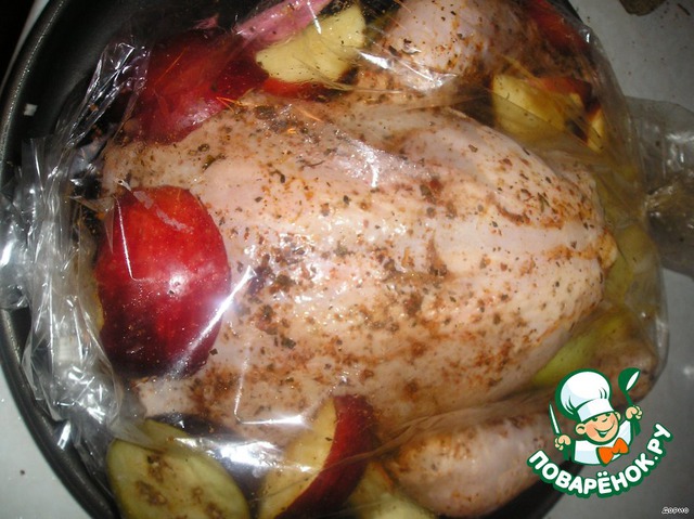 Курочку натираем специями. Помещаем в рукав для запекания. Начиняем яблочками, синенькими и перчиками. Оставшиеся овощи - фрукты кладём вокруг красотки.