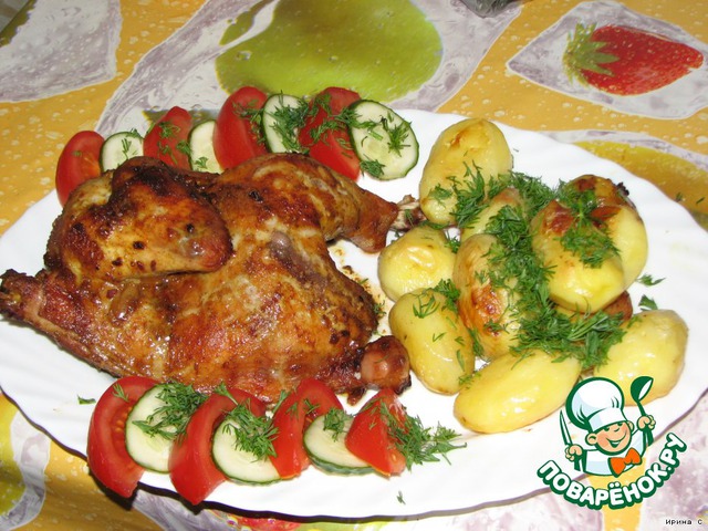 Выкладываем курицу и картошку на противень. Ставим в духовку, предварительно разогретую до 170° С. Оставшимся соусом периодически поливайте курицу. За 5 минут до конца приготовления курицу сверху смазать кусочком сливочного масла и включить верхний тэн.