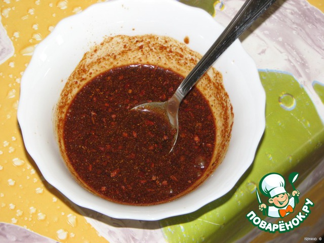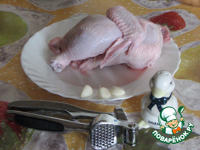 Выдавить чеснок и получившейся кашицей натереть курицу. Дать постоять 10 минут.