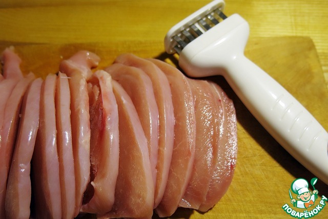 Нарезаем мясо на пластины толщиной около 0,7 см и отбиваем. Либо размягчаем с помощью размягчителя мяса. Мясо можно, по желанию, поперчить или добавить специи, но солить ничего не нужно. Майонез и сыр дадут нужную соленость отбивной.