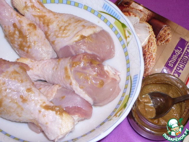 Натираем куриные голени смесью сахара (меда) и соли, горчицей (обычная или в зернах).