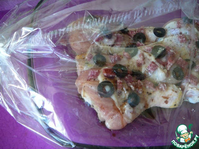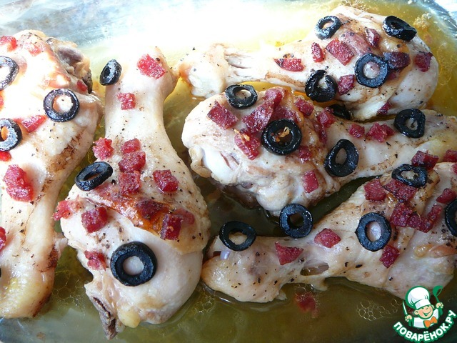 Мелко нарезаем колбасу, оливки, чеснок. Закладываем чеснок и колбасу под кожицу, маслины и колбасу раскладываем поверху ножек. Выкладываем в форму, "припудриваем" ножки душистым перцем, сбрызгиваем бальзамическим уксусом (или соком лимона). И в духовку при Т 200-220С. Примерно, минут на 30-40.