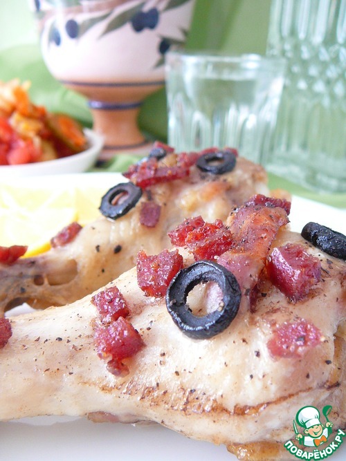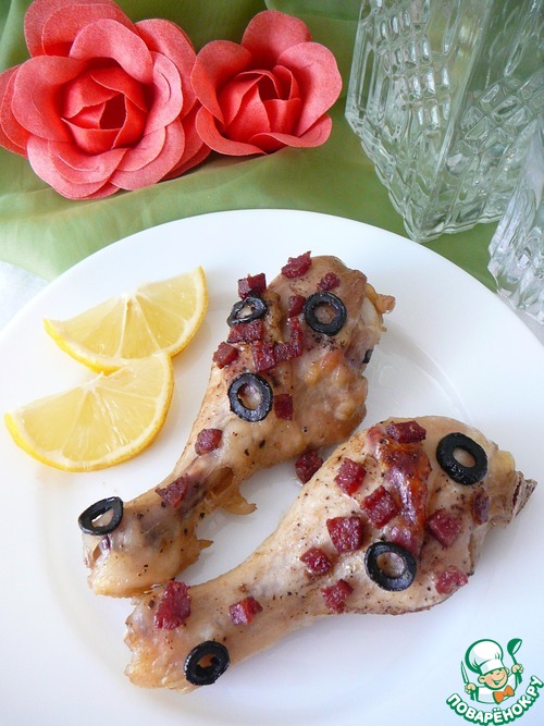 | Куриные голени (они же "ножки") просты в приготовлении, хороши с гарниром и без гарнира, уместны на любом застолье. А раз так, знакомьтесь, еще одна вариация на тему -- запеченные куриные "ножки" в горчице с оливками, чесноком и копченой колбасой. Быстро, вкусно и нарядно! А какой аромат! |