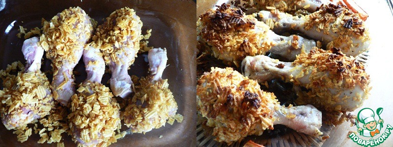 -По одной ещё раз обмакнуть куриные ножки в яичную смесь, а затем обсыпать чипсами. Проделать тоже самое со всеми ножками.