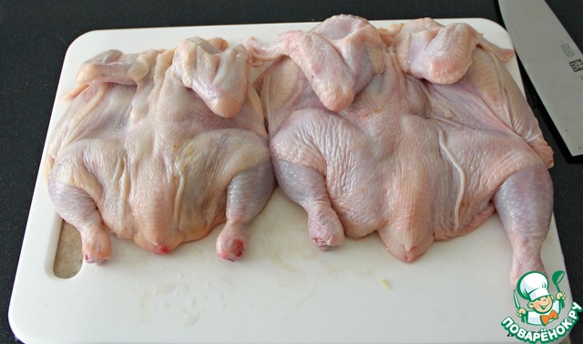 Берем молодых цыплят. Хорошенько их промываем, высушиваем бумажными полотенцами и пластаем так.