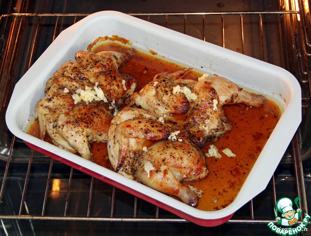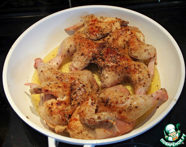 Поскольку цыплята молодые, много времени это не займет. За пять минут до готовности добавляем чеснок.