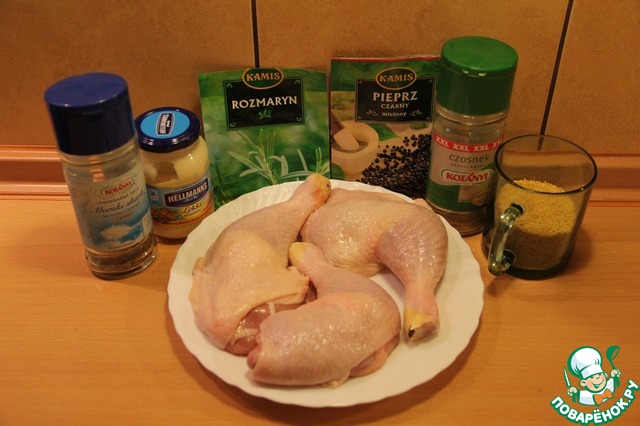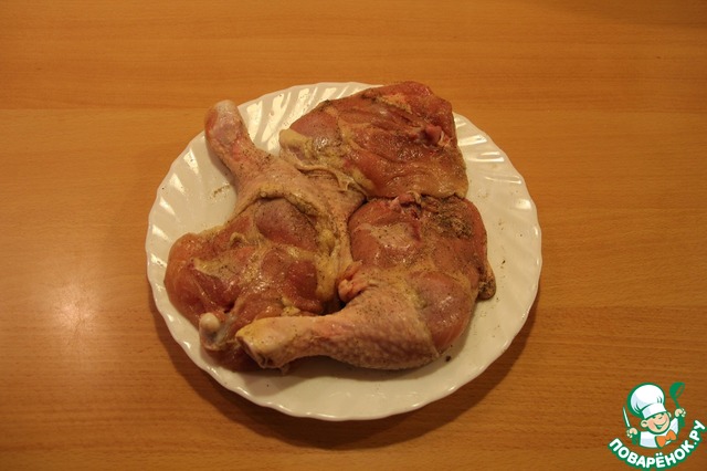 Окорочка промываем, сушим бумажным полотенцем и натираем солью и специями.