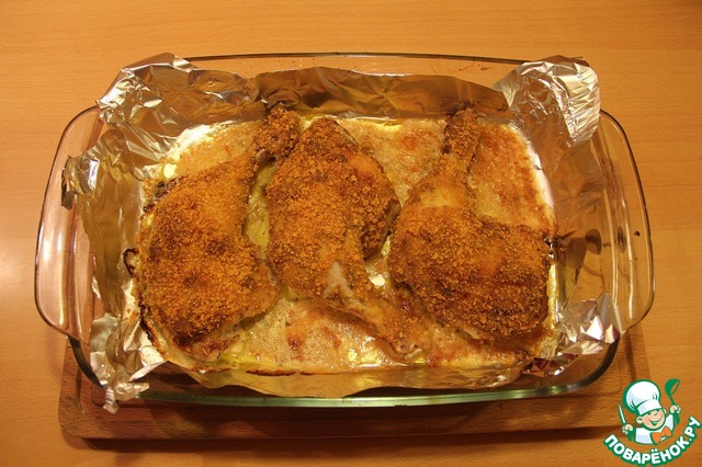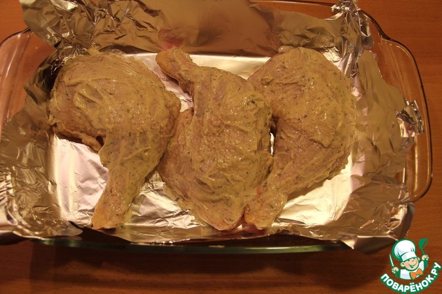 Получившимся соусом обмазываем окорочкa и укладываем в жаропрочную посуду на фольгу.