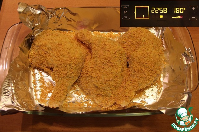 Кукурузные хлопья перетираем руками или блендером и посыпаем окорочка.