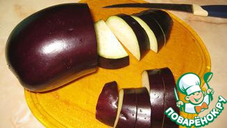 Нарезанный баклажан заливаем холодной водой с 2-я столовыми ложками соли и оставляем на 15 минут, это нужно, чтобы баклажан не горчил.