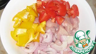 К филе отправляем нарезанный полукольцами лук, болгарский перец и помидор