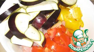 Сливаем воду из баклажанов, выкладываем в тарелку с филе и овощами.