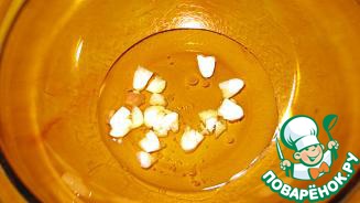 К оливковому маслу добавляем нарезанный зубчик чеснока, оставляем на 3 минуты, чтобы чеснок отдал сок.