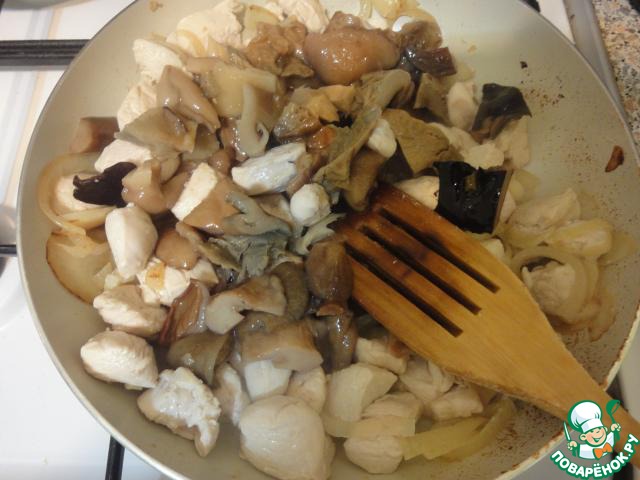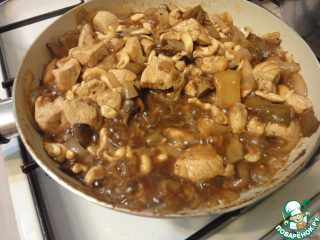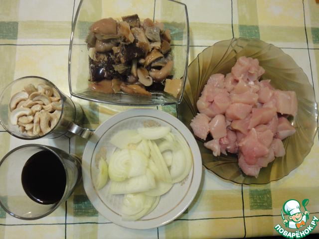Лук режем полукольцами, филе небольшими кусочками, из банки с грибами сливаем жидкость (если попадаются крупные грибы - измельчаем), 100 грамм кешью и 100 мл грибного соевого соуса.