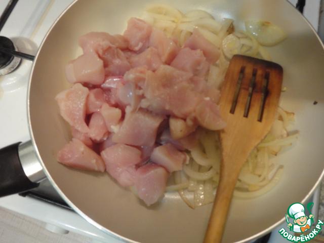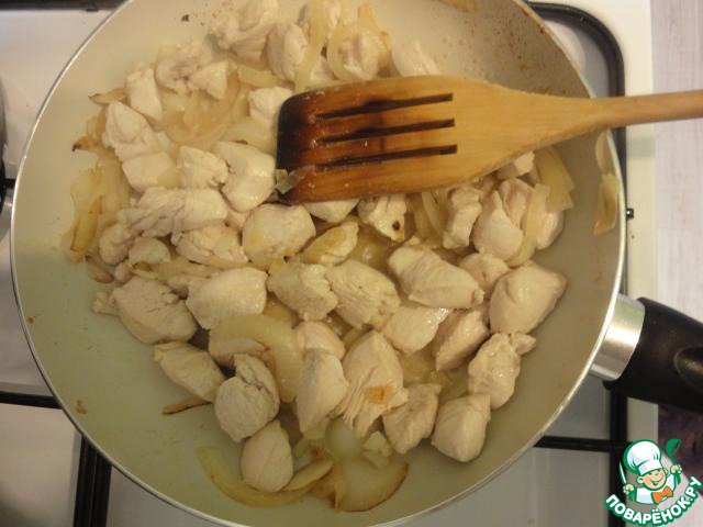 Берем сковороду и разогреваем ее. Добавляем немного растительного масла. Как только сковорода нагрелась, выкладываем в нее лук, чуть обжариваем и выкладываем кусочки курочки.
