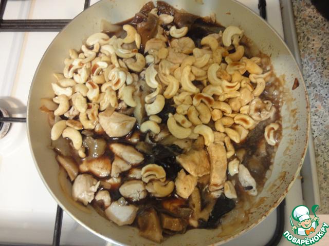Дальше мы добавляем орехи кешью и заливаем всё грибным соевым соусом.